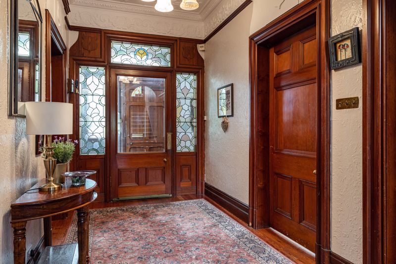 The property has a blend of many original and modern features situated over 3 floors. Timber front door leads to entrance hallway with stained glass windows, tiled floor and partition to main hall. Off the main hallway is the drawing room/lounge, sitting room, snug/office, cloaks WC and kitchen. Leading from the sitting room is a conservatory with a door to the garden. From the kitchen is a laundry room and storeroom, with a back door to the courtyard. The main staircase has ornate balustrading, timber handrail and stained-glass windows leading to the first floor.